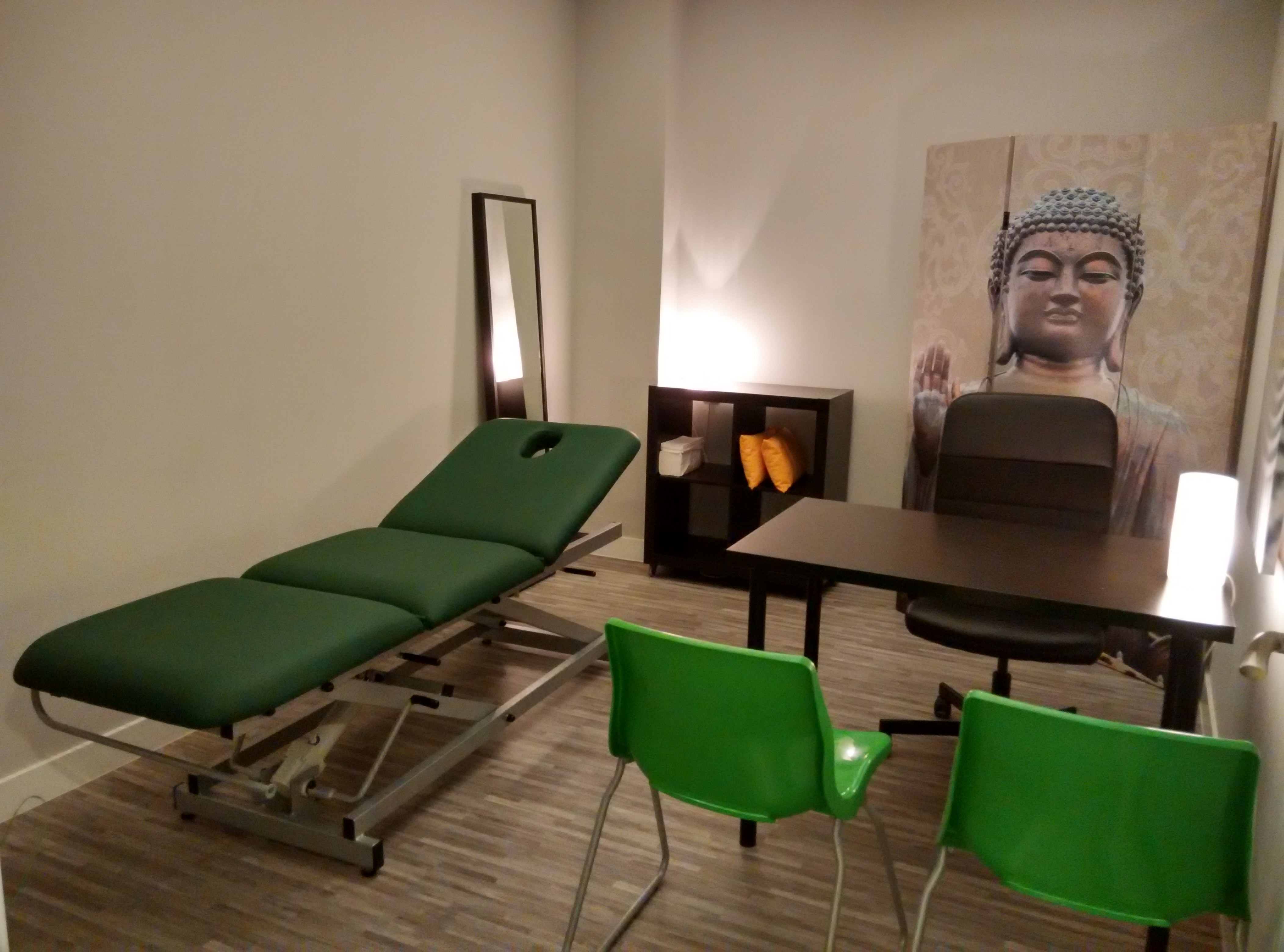 Cabina equipada con lavabo, estantería, iluminación adecuada, música ambiente, mesa, toma de corriente, wifi, y sábanas desechables. Esta sala puede configurarse como despacho de terapia dependiendo de las necesidades específicas del coworker, con camilla o sillones.